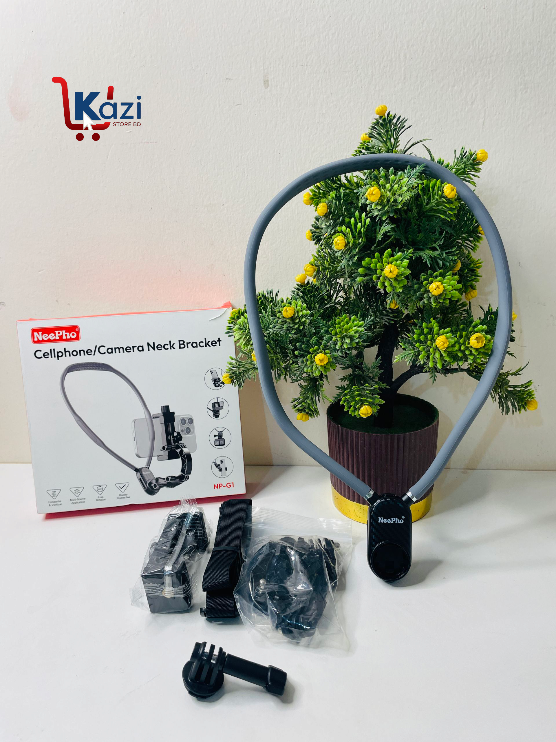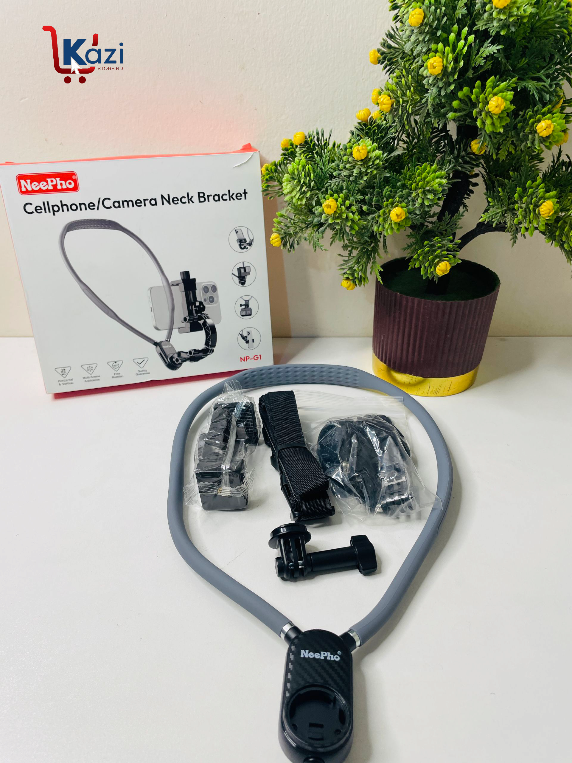 The product shown is the NeePho NP-G1 Neck Holder Cellphone/Camera Neck Bracket. This neck holder is designed for hands-free content creation, allowing users to wear it around their neck for first-person view (POV) video recording or comfortable hands-free viewing.